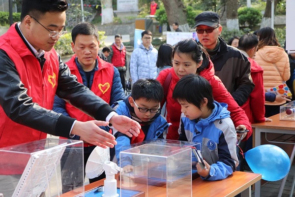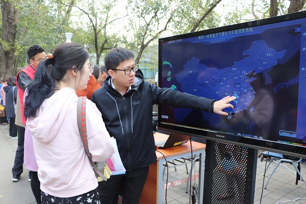 通过宣传显示屏向市民朋友们介绍海陆一体智能天气雷达与灾害预警系统的工作原理。