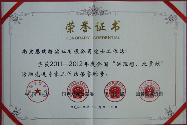 11月26日,中国科协、国家发展改革委、科技部和国务院国资委在北京联合授予南京恩瑞特实业有限公司院士工作站“先进院士专家工作站”荣誉称号。此次是2011-2012年度全国“讲理想、比贡献”活动先进集体、科技标兵、优秀组织者评选,全国科协系统共有50家单位获此殊荣。