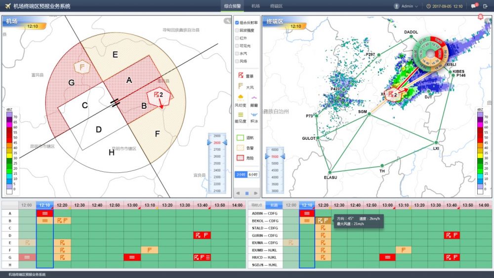 基于多源资料融合、短临外推、快速循环同化数值预报和Bleding融合预报等先进技术,构建终端区强对流预报预警平台。满足机场终端区与机场两个区域0-6小时无缝隙天气监测和预报,并针对航空高影响的强对流天气,实现终端区的进近扇区、导航点、航路、进近5边以及机场跑道等位置的强对流告警和预警,为终端区管制员指挥航班有序着落和起飞提供及时高效和精准的气象信息支持。
