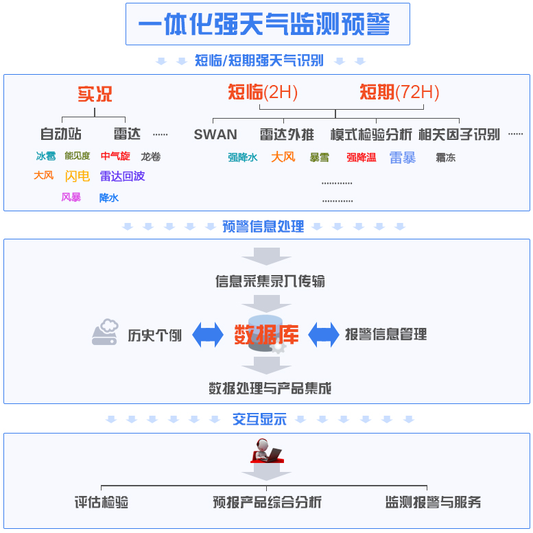 基于CIMISS构建省市县一体化气象数据服务环境,面向省市县三级气象部门开展各类气象业务的需要,构建以实况监测、短时临近预报、数值预报释用、灾害性天气识别、综合天气预警、精细化格点预报、预报服务产品制作、预报预警检验等为核心的集约化高交互预报业务平台,全面提升主客观预报能力及预报业务体系化程度。