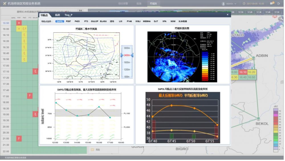 基于多源资料融合、短临外推、快速循环同化数值预报和Bleding融合预报等先进技术,构建终端区强对流预报预警平台。满足机场终端区与机场两个区域0-6小时无缝隙天气监测和预报,并针对航空高影响的强对流天气,实现终端区的进近扇区、导航点、航路、进近5边以及机场跑道等位置的强对流告警和预警,为终端区管制员指挥航班有序着落和起飞提供及时高效和精准的气象信息支持。